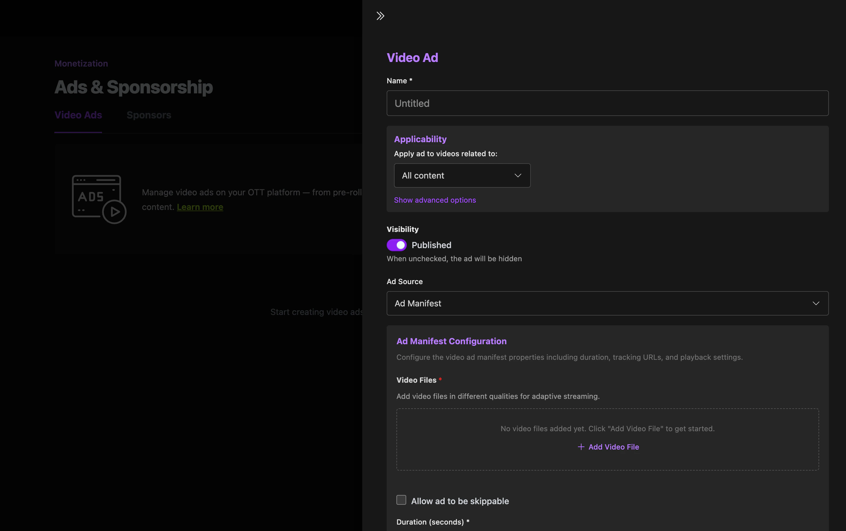 Advertising monetisation allows you to generate revenue by placing ads in your video streams. Motto currently supports pre-roll ads. Advertising is commonly used for free-to-watch platforms, or as part of a hybrid model.