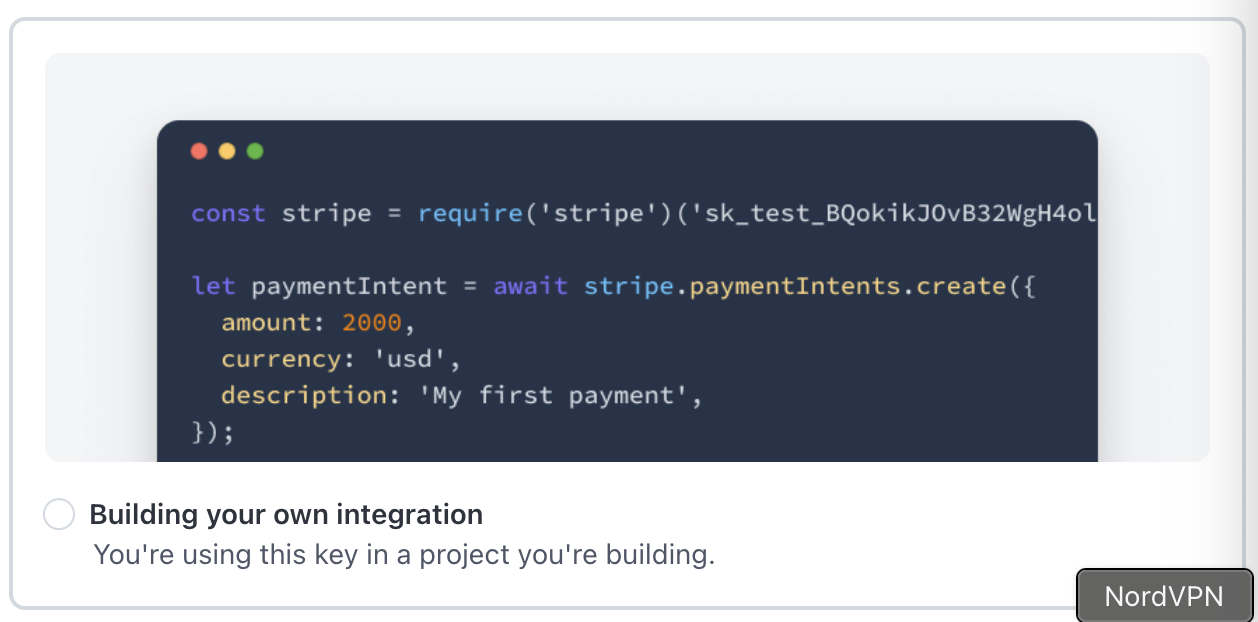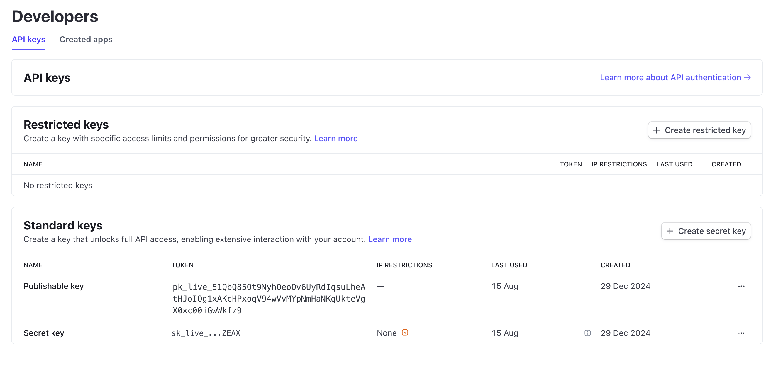 - Secret key (or restricted key): Used for server-side operations, such as creating charges and managing subscriptions