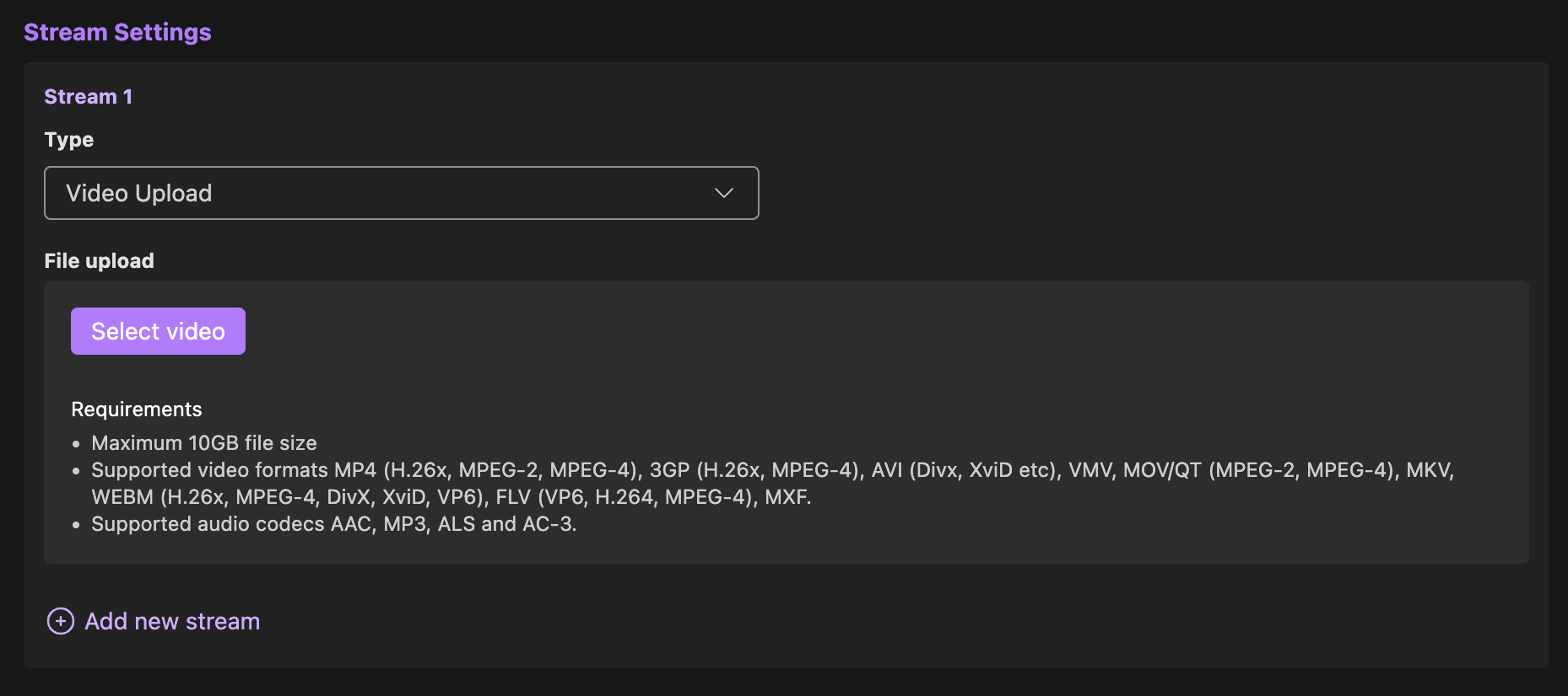 When using the Studio, VOD creation is a part of the process of creating a new event or creative work. When doing so, you will be asked to create one or more “streams”, after which you can select “Video Upload”. If you are uploading a large file (like a full sports match), this may take a while, and it is important to keep your browser window open during the upload.