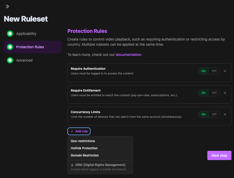 Each of these protection features is referred to as a rule. A rule is a single protection measure — for example, a geo-restriction that blocks playback outside of France, or a domain pin that limits playback to your website. Rules are grouped into rulesets. A ruleset can contain any combination of rules and is applied to one or more pieces of content. For example, you could create a ruleset that combines geo-blocking with domain pinning, and apply it to an entire competition. You can apply multiple rulesets to the same content. When you do, Motto merges them field by field based on priority. For each rule type, the value from the highest-priority ruleset wins. Rule types that only appear in one ruleset are unaffected — they apply as-is regardless of priority. This means your rulesets stay modular. For example, you could create a platform-wide ruleset that enforces a registration wall for all content, and then create a separate ruleset that geo-blocks a specific competition to the countries where you hold the broadcasting rights. Both rulesets apply together, and neither needs to know about the other’s rules. Rulesets are reusable and can target anything from a single video to all of your content at once. For more information on how to scope your rulesets, see target selection.
